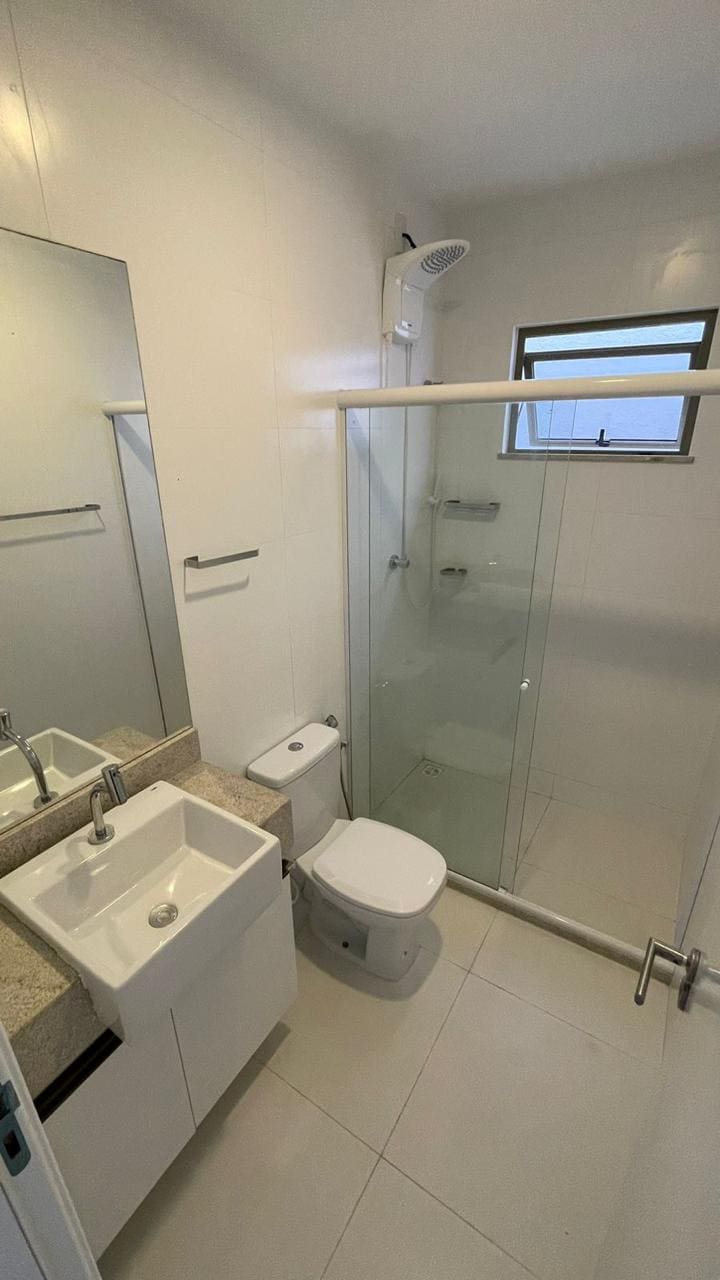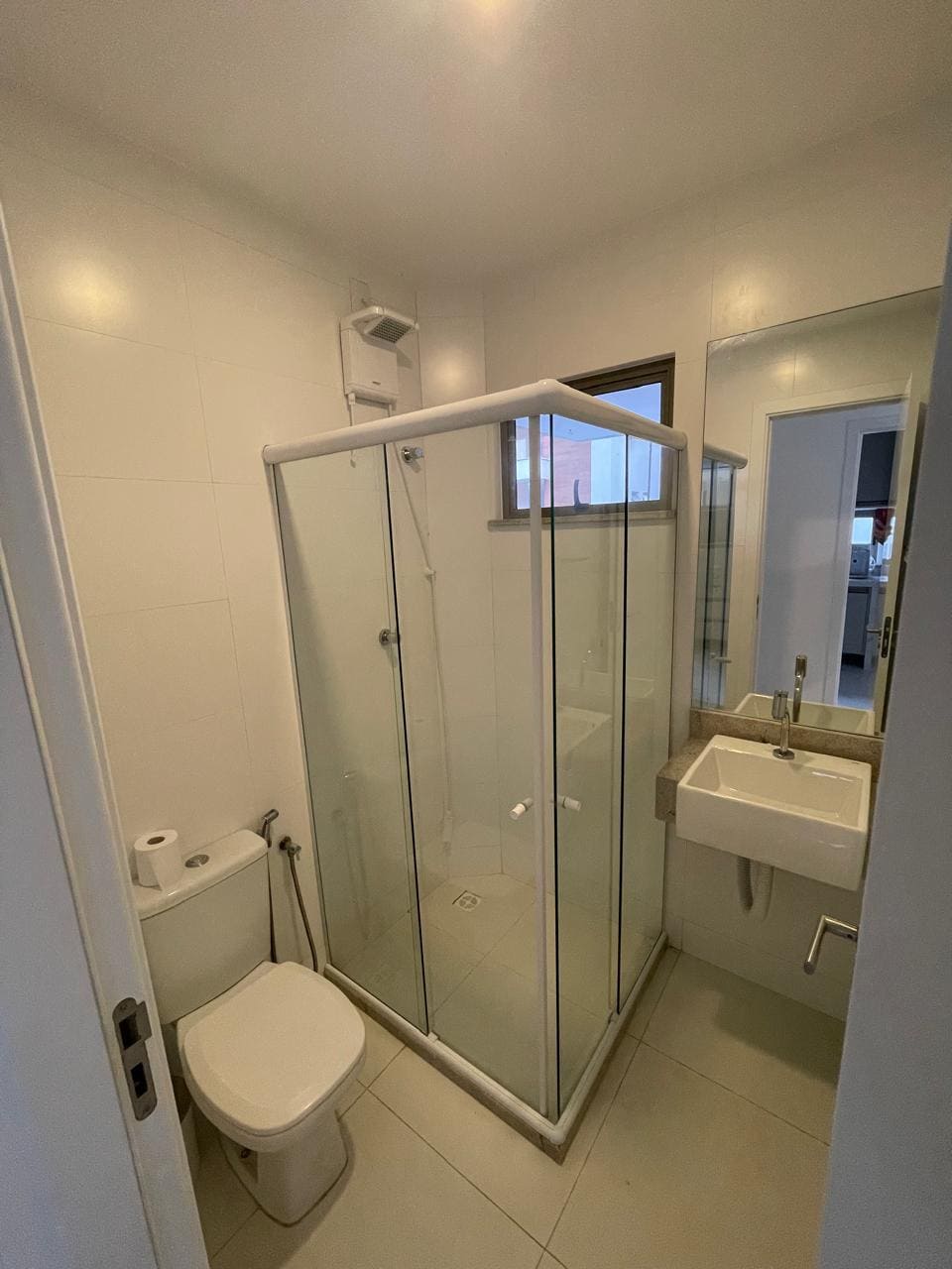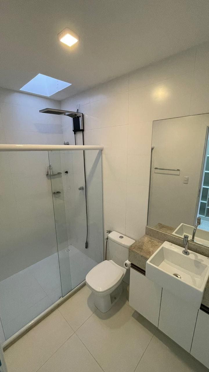 🚿 Banheiro completo com armários planejados, bancada em mármore e box em vidro.