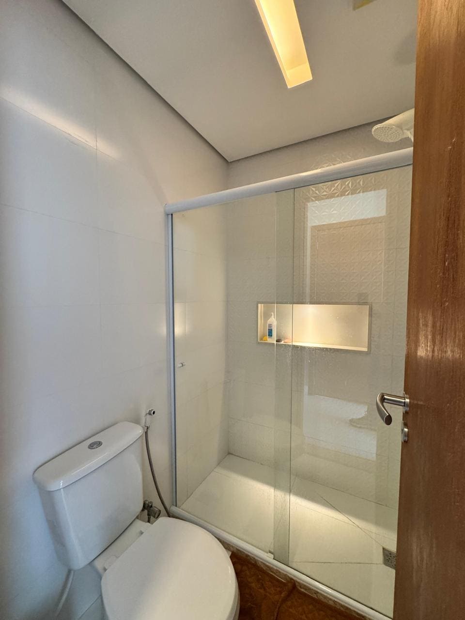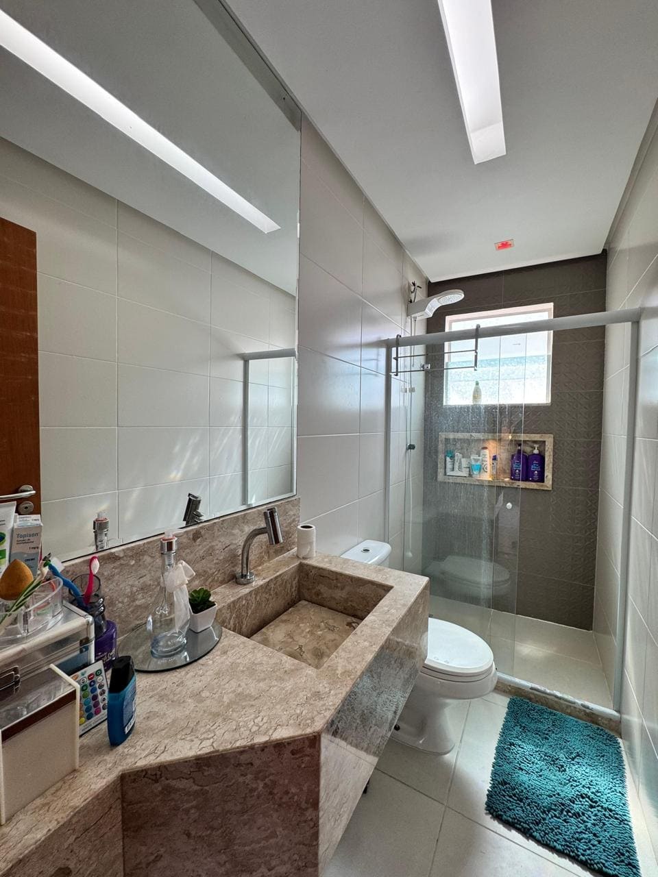 🚿 Banheiro completo com armários planejados, bancada em mármore e box em vidro.