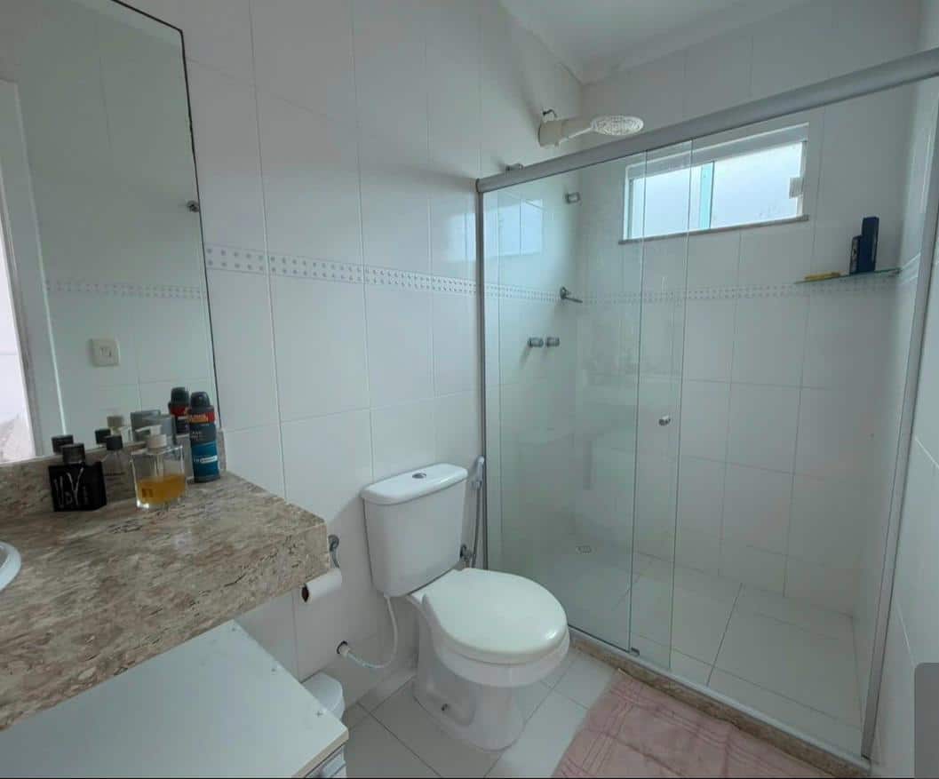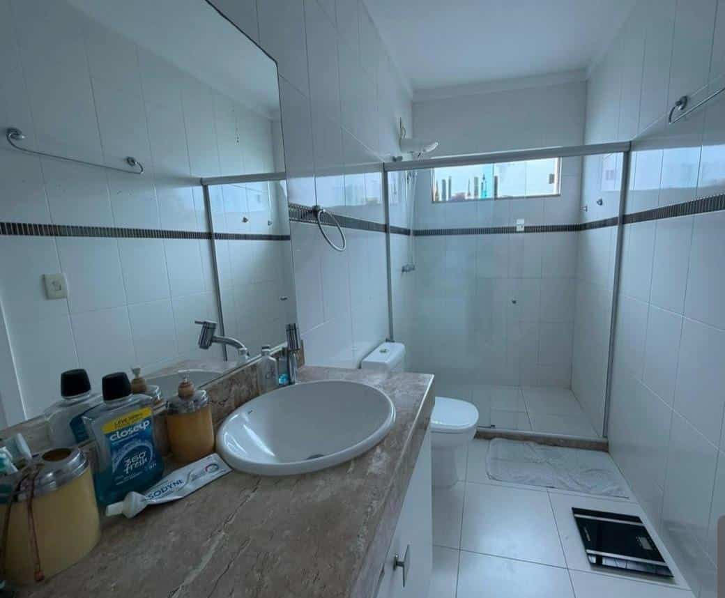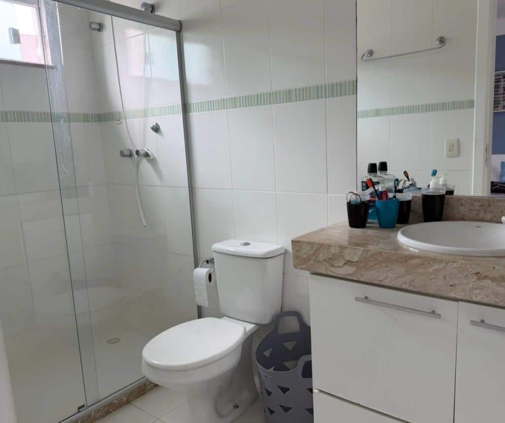 🚿 Banheiro completo com armários planejados, bancada em mármore e box em vidro.